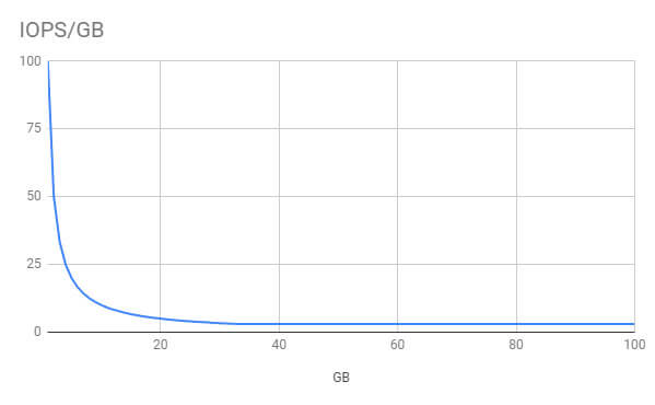 For gp2 volumes (the primary type), you don’t get more IOPS as you grow from 1GB to 33GB. The next graph displays this inverse proportionality. The decrease is due to the minimum of 100 IOPS for all gp2 volumes. Read another way, you’ve got to buy 34x what you’ll probably need in your first 6 months to get any additional throughput, which you probably won’t need for your first year.