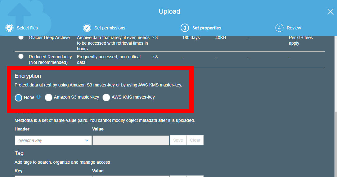Enable S3 object encryption on the “Set properties” section of the upload wizard in S3.