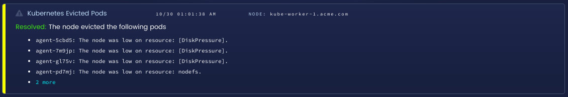 One of the most useful events we monitor at Blue Matador happens when a node begins evicting pods. The Evicted reason is actually not included in the source file with the other events, but can be found in the eviction source code. This event happens when a node determines that pods need to be evicted, or terminated, to free up some resource such as CPU, memory, or disk. We were made aware by one of our users that this can have devastating consequences if the kubelet is unable to determine the best resources to evict. The specific case that one user experienced involved the kubelet detecting disk pressure, then evicting pods that have no effect on disk usage. The pods would then get scheduled on other nodes, overloading their other resources and also causing evictions. Knowing when evictions happened, and being able to correlate it with other events in that time frame, has helped them avoid the issue.
