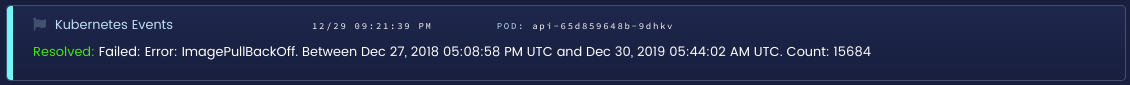 The first event we will cover is the one from my first example: Failed. Failed is a seemingly vague reason that actually only corresponds to issues creating a container. The most common specific type of failure I have seen is the system being unable to pull the docker image. We’ve all had this happen before, usually due to either a typo, a permissions issue to your docker repo, or a build failing upstream from your deploy. Your container simply will not run until you fix the issue. If you are automatically deploying updates to your cluster, you will want to look out for this event because it can easily break your deployments.